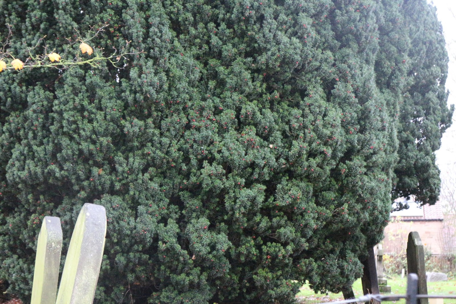 The 'graveyard' tree. dark and massive it sits sturdy and strong guarding the dead, though Geoffrey Grigson says according to a 1664 quote that rather than scare away devils it was planted because they "attracts and imbibes putrefaction and oleaginous vapours exhaled out of the Graves by the setting sun and sometimes drawn into those Meteors called Ignes Fatui".